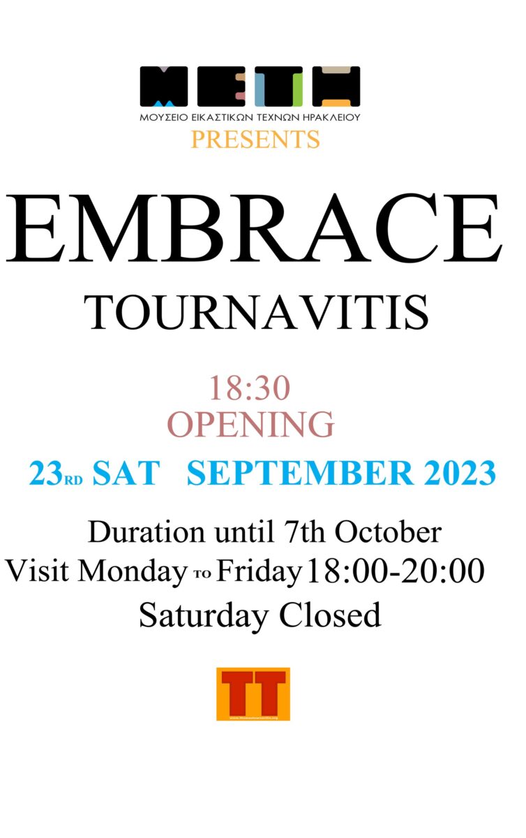 Με μεγάλη χαρά ύστερα από μερικά χρόνια το Μουσείο Εικαστικών Τεχνών Ηρακλείου ( ΜΕΤΗ ) υποδέχεται εκ νέου τον Θωμά Τουρναβίτη που παρουσιάζει την ενότητα Embrace,στο φιλότεχνο κοινό της Κρήτης.