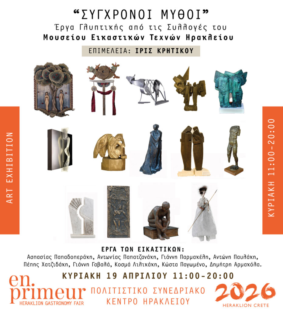 Παράλληλα, στον ίδιο χώρο παρουσιάζεται η έκθεση «Σύγχρονοι Μύθοι», σε επιμέλεια της αρχαιολόγου και ιστορικού τέχνης Ίριδας Κρητικού, η οποία φέρνει στο κοινό σημαντικά έργα γλυπτικής από τις συλλογές του Μουσείου Εικαστικών Τεχνών Ηρακλείου, δημιουργώντας έναν ουσιαστικό διάλογο ανάμεσα στην οινική και την εικαστική δημιουργία.